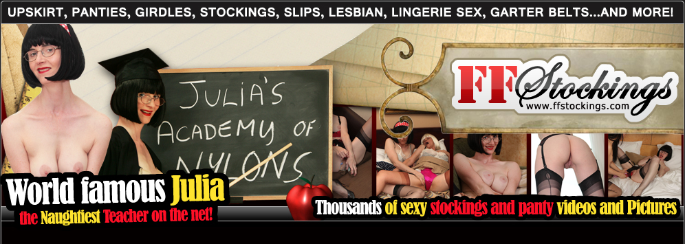 Hi this is Julia the Naughty Teacher. I have worn stockings and girdles since I was a young woman. Now you can see my friends and I show you what we all love to wear. Vintage girdles, garter belts, stockings and suspenders, slips, high heels, bras and panties. My site is all about vintage lingerie, girl girl sex, and upskirt peeks. My panties are all briefs and bikini's and my stockings are real nylon. If these pictures turn you turgid, drop by and have a look at all the free pictures I have. Featured in Leg Show Magazine.